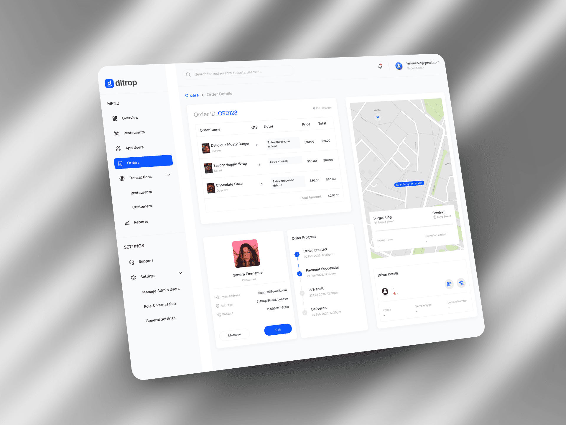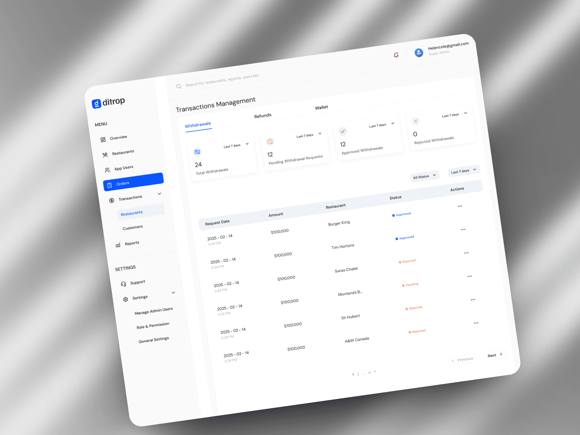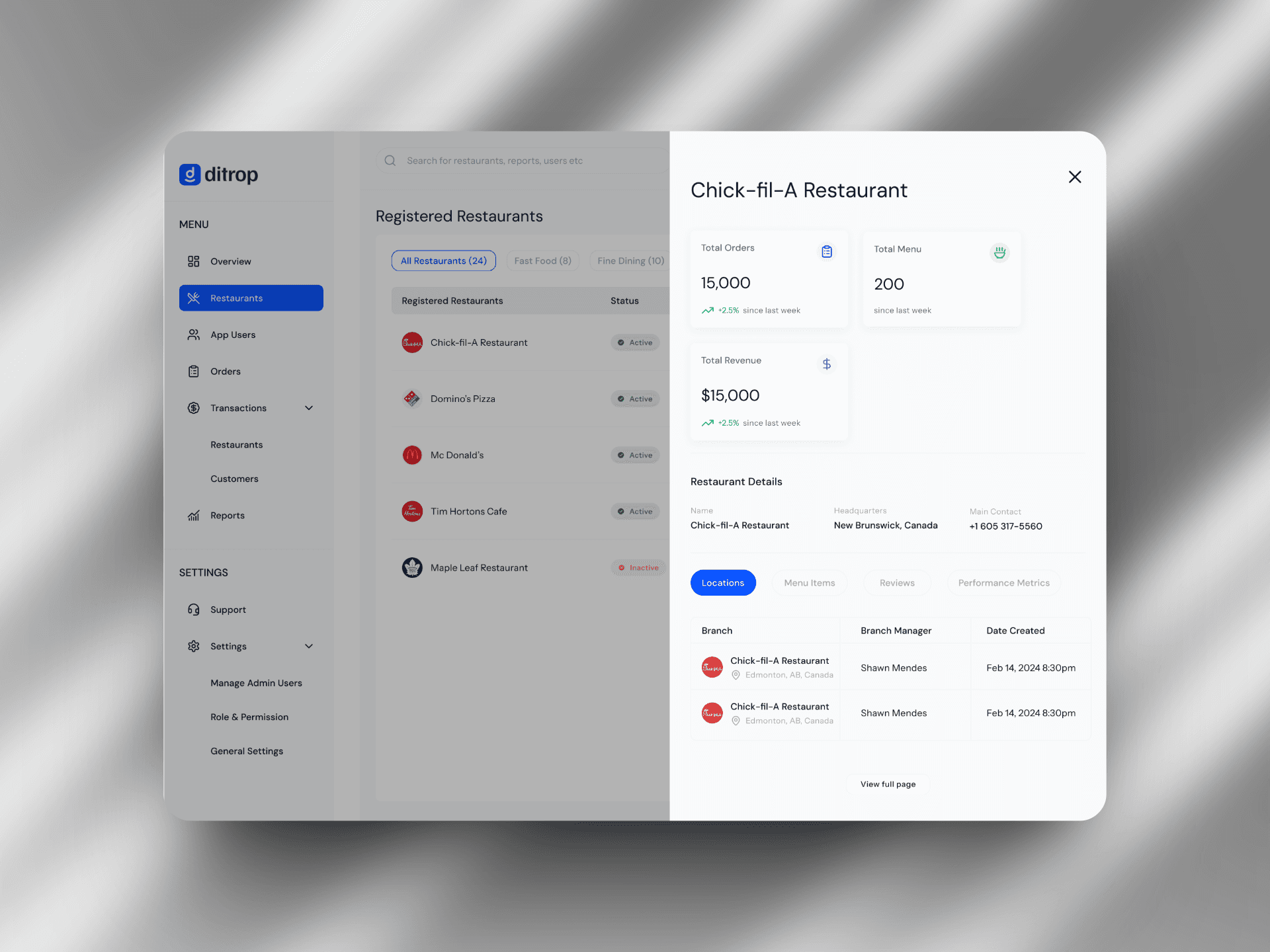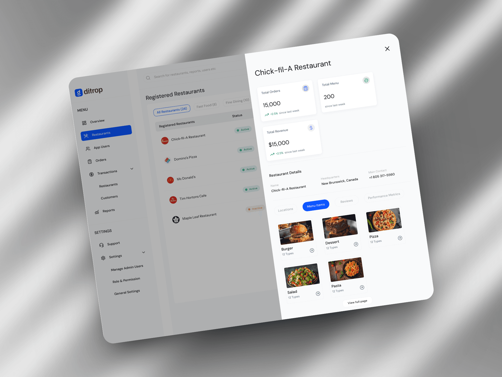 Ditrop is an admin dashboard for restaurant platform managers, providing real-time insights into performance, user activity, and financial metrics. It simplifies complex operations into efficient management.